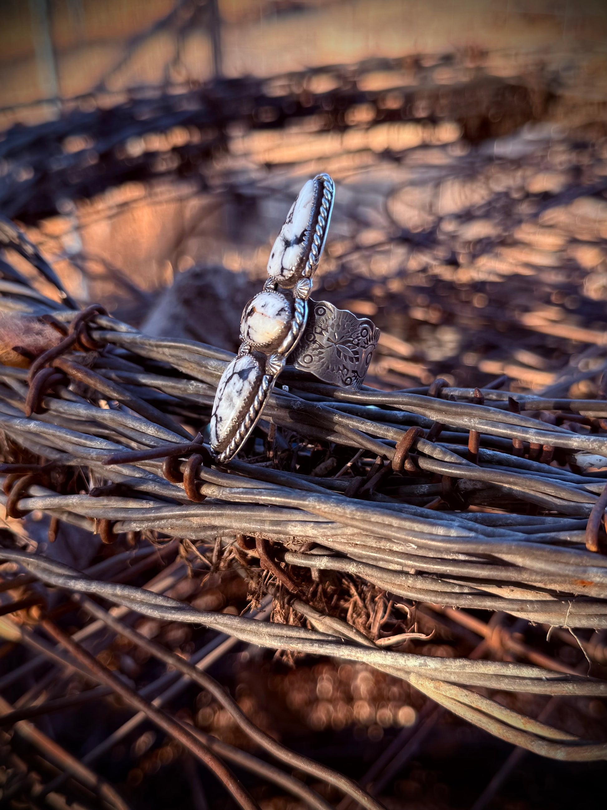 This stunning statement ring is truly one of a kind, featuring rare White Buffalo set on a hand-stamped, adjustable band. Every detail is crafted by hand, making it as unique as the sacred stone it holds.