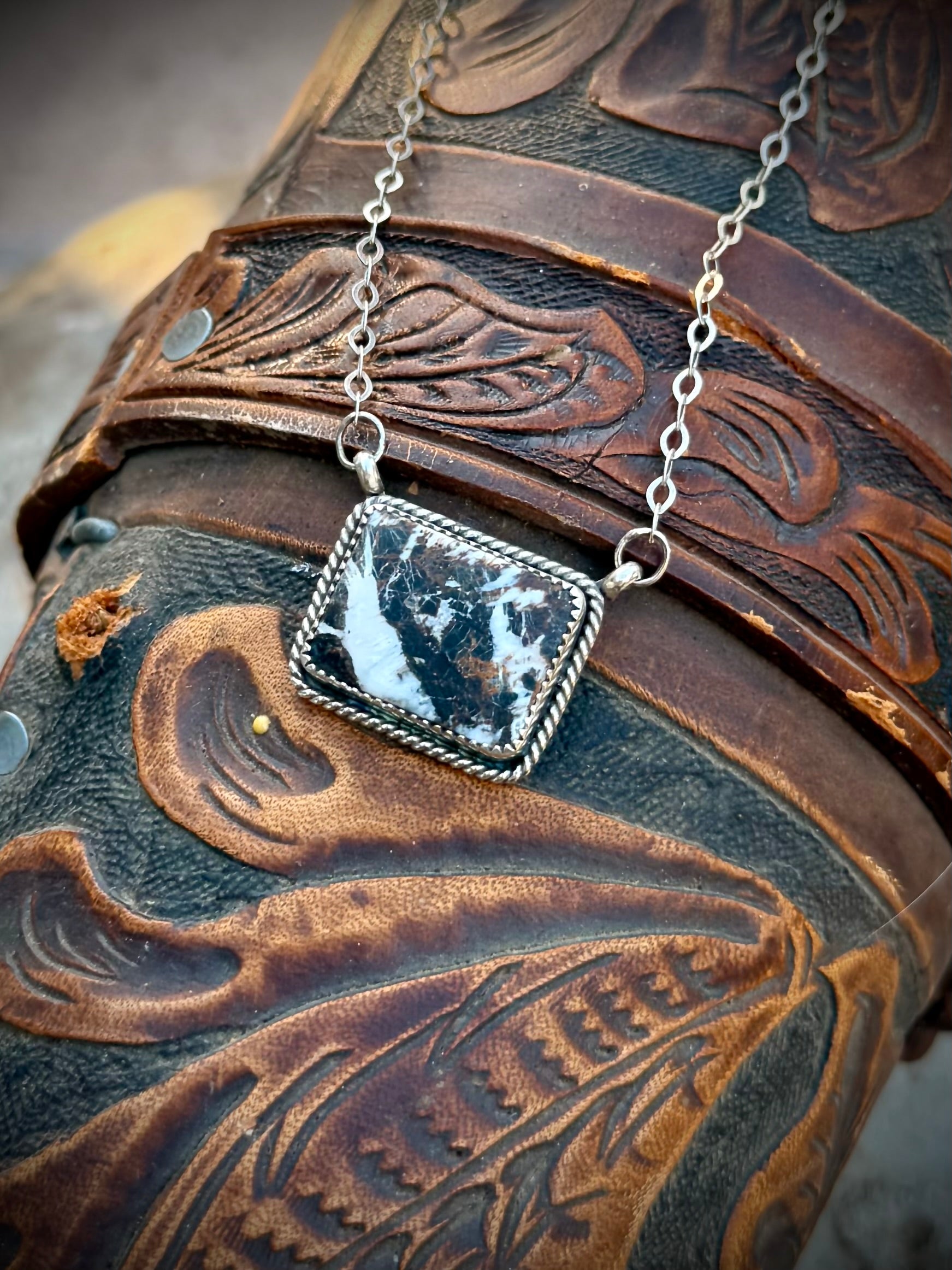 Despite its name, it’s not actually turquoise, but a mix of white calcite and black chert that gives it that striking marbled look. Its loved, not just for its beauty, but because white buffalo is seen by many Native American cultures as a symbol of hope, renewal, and sacred blessings. It’s a piece that feels both earthy and meaningful — simple enough for everyday wear, but full of story.